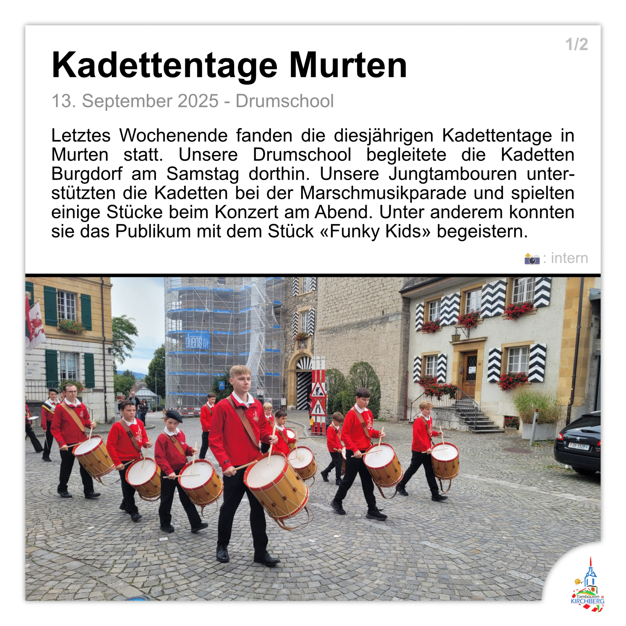 Letztes Wochenende fanden die diesjährigen Kadettentage in Murten statt. Unsere Drumschool begleitete die Kadetten Burgdorf am Samstag dorthin. Unsere Jungtambouren unterstützten die Kadetten bei der Marschmusikparade und spielten einige Stücke beim Konzert am Abend. Unter anderem konnten sie das Publikum mit dem Stück «Funky Kids» begeistern.