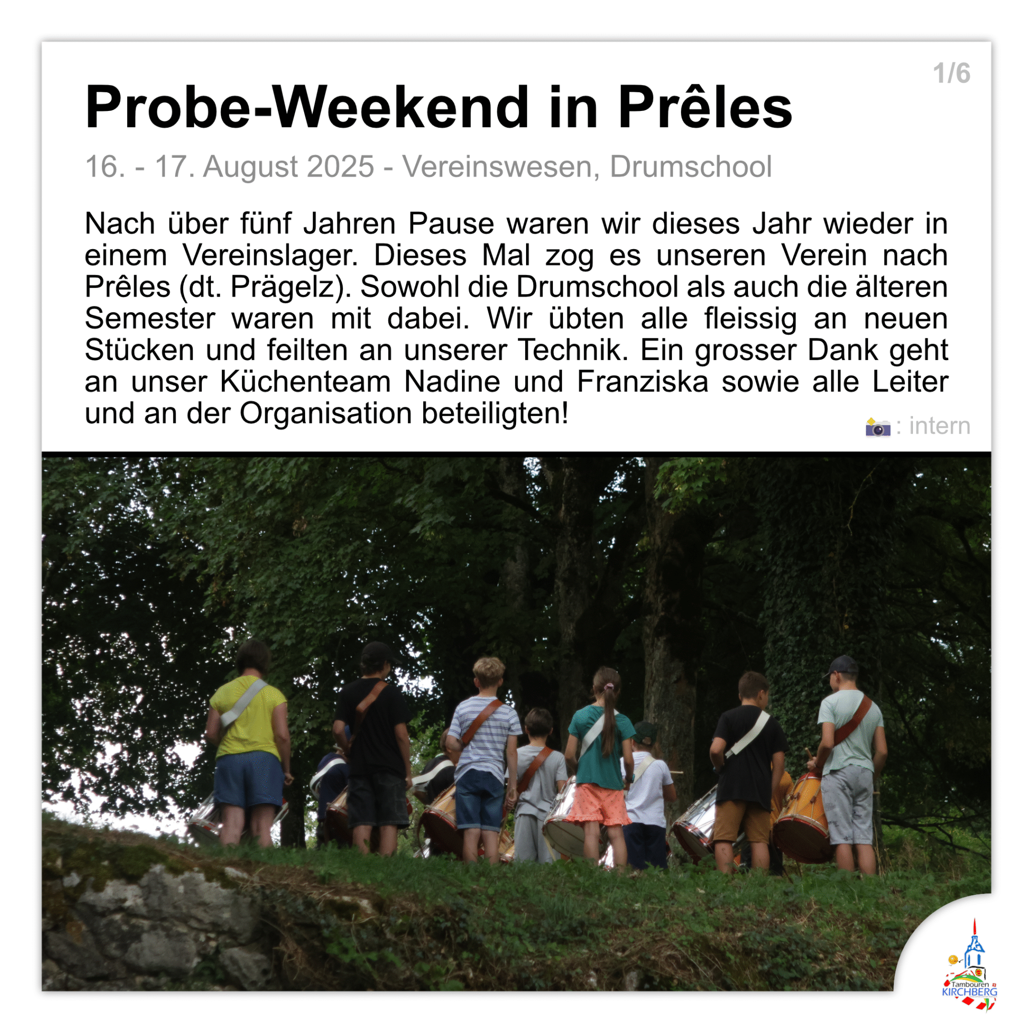 Nach über fünf Jahren Pause waren wir dieses Jahr wieder in einem Vereinslager. Dieses Mal zog es unseren Verein nach Prêles (dt. Prägelz). Sowohl die Drumschool als auch die älteren Semester waren mit dabei. Wir übten alle fleissig an neuen Stücken und feilten an unserer Technik. Ein grosser Dank geht an unser Küchenteam Nadine und Franziska sowie alle Leiter und an der Organisation beteiligten!